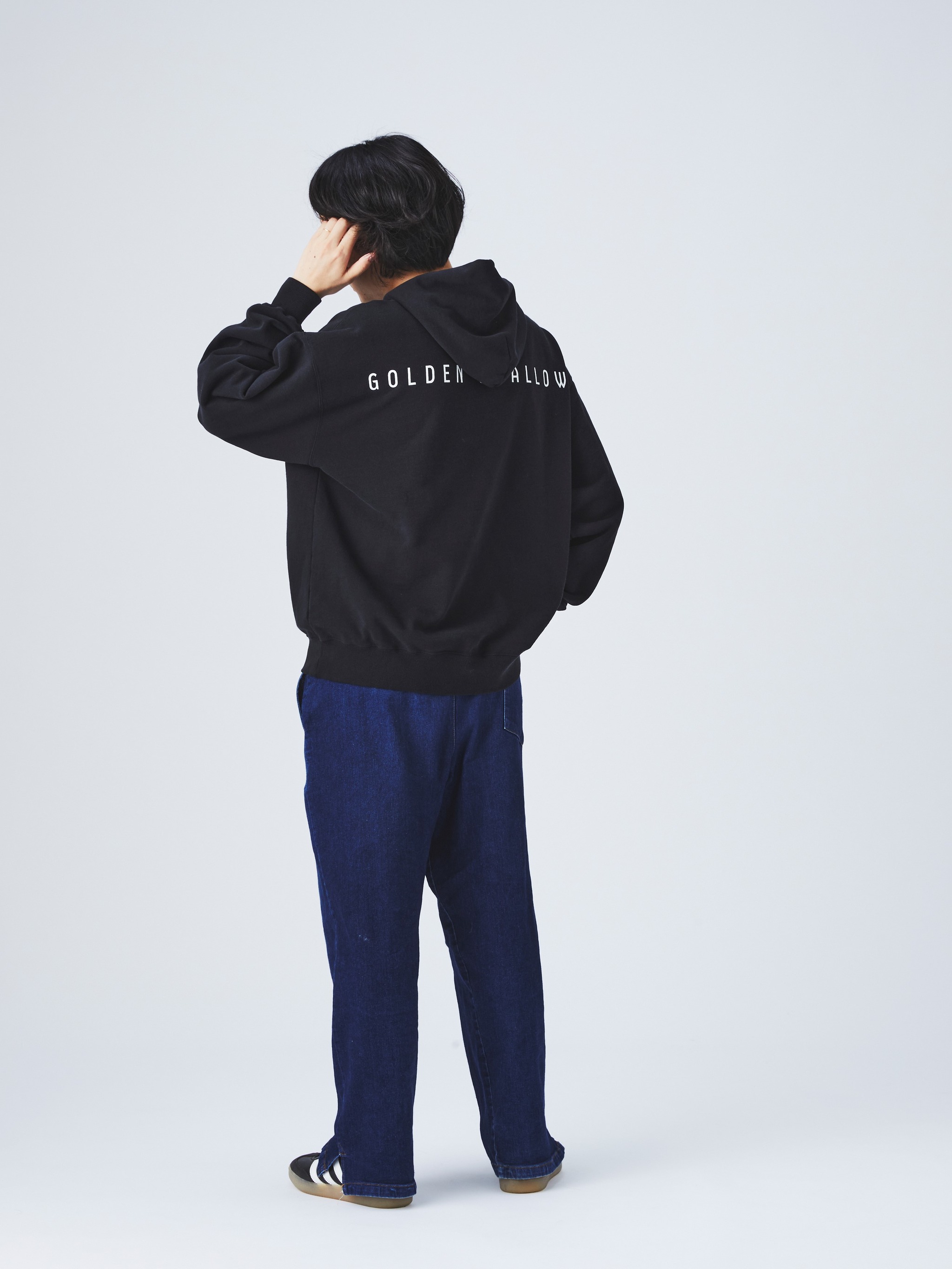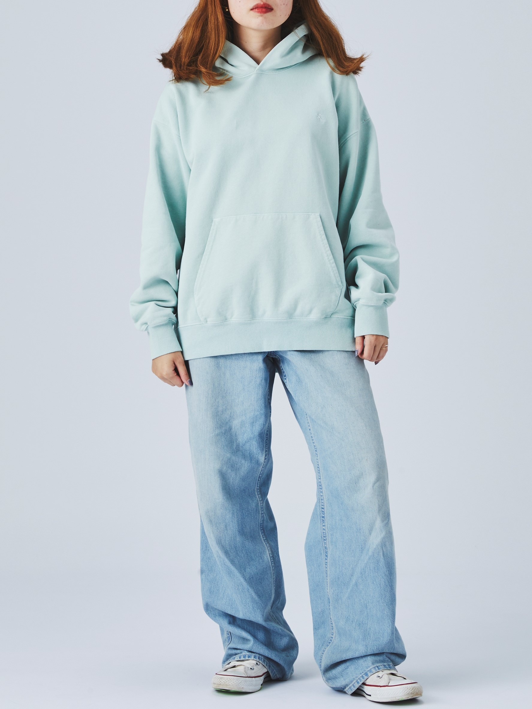 パーカーの裾をデニムのウエストに少しだけ挟んで